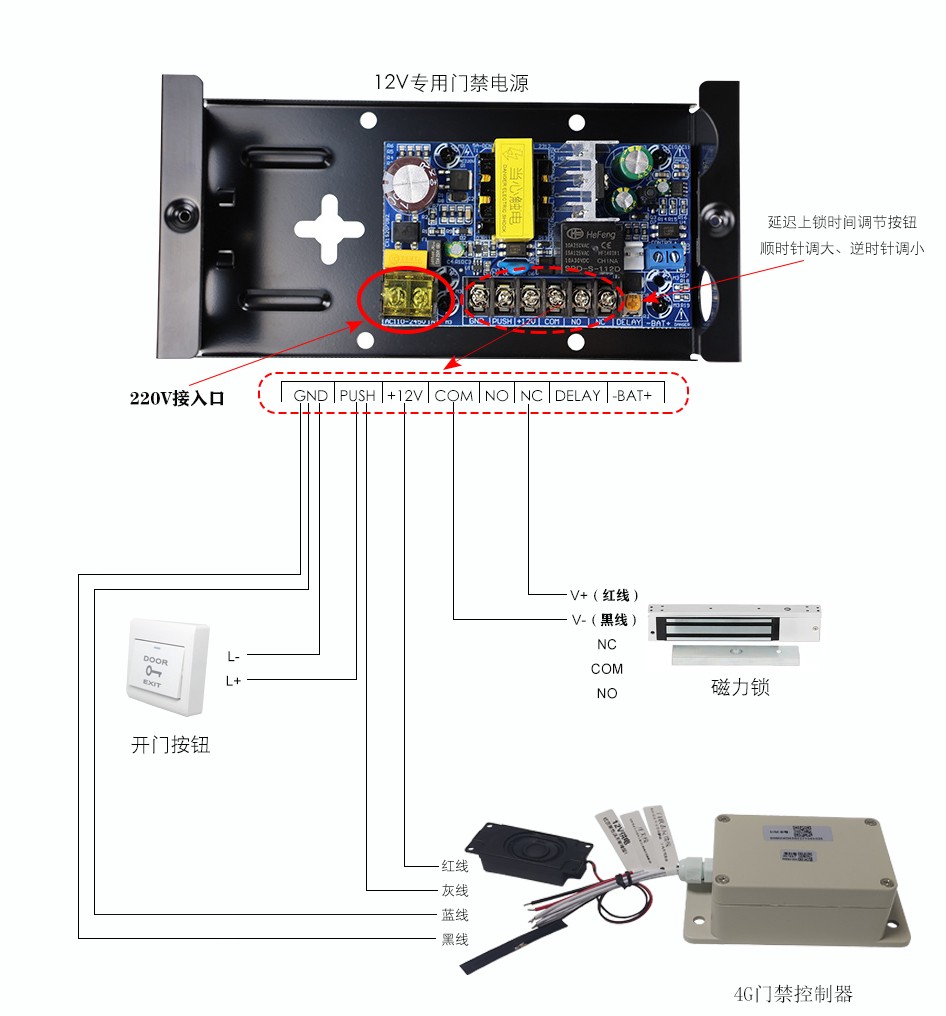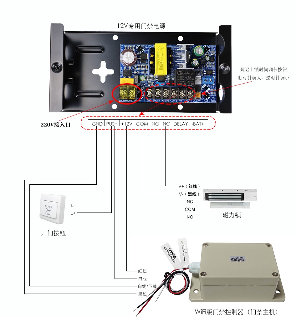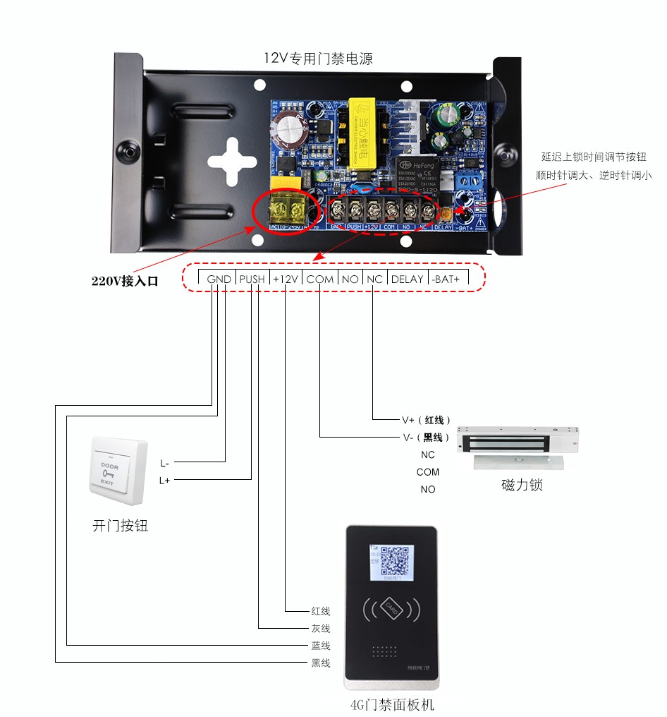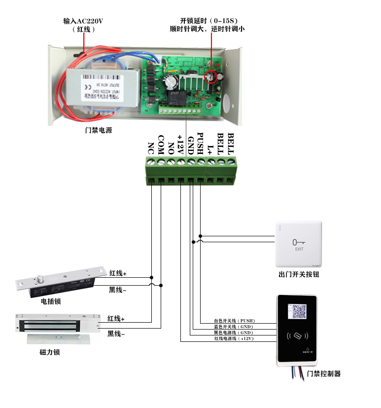 1.带专用门禁电源的接线方式(磁力锁、电插锁)