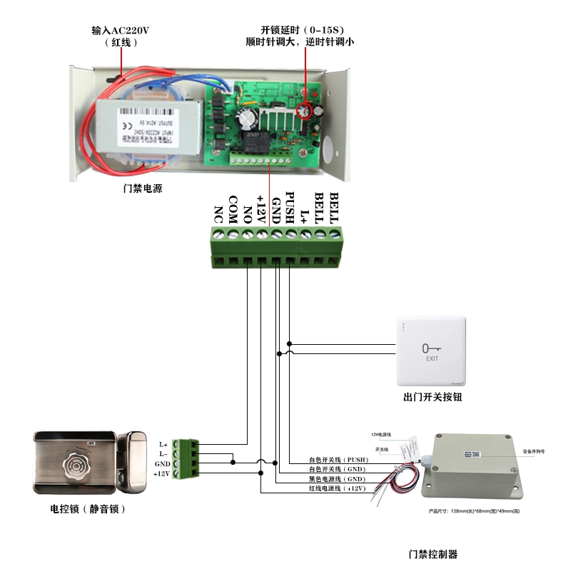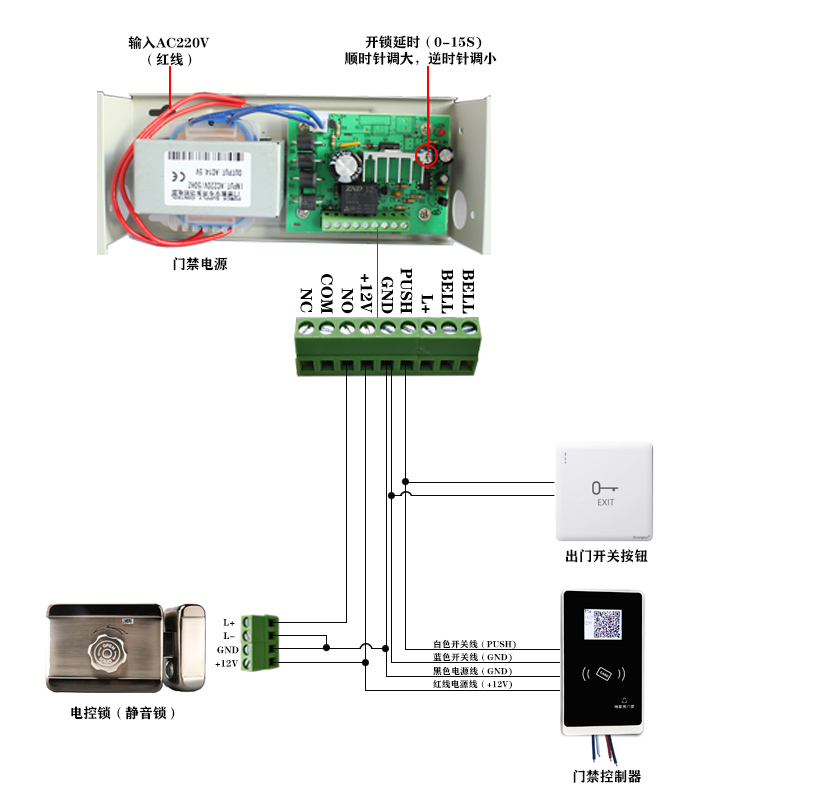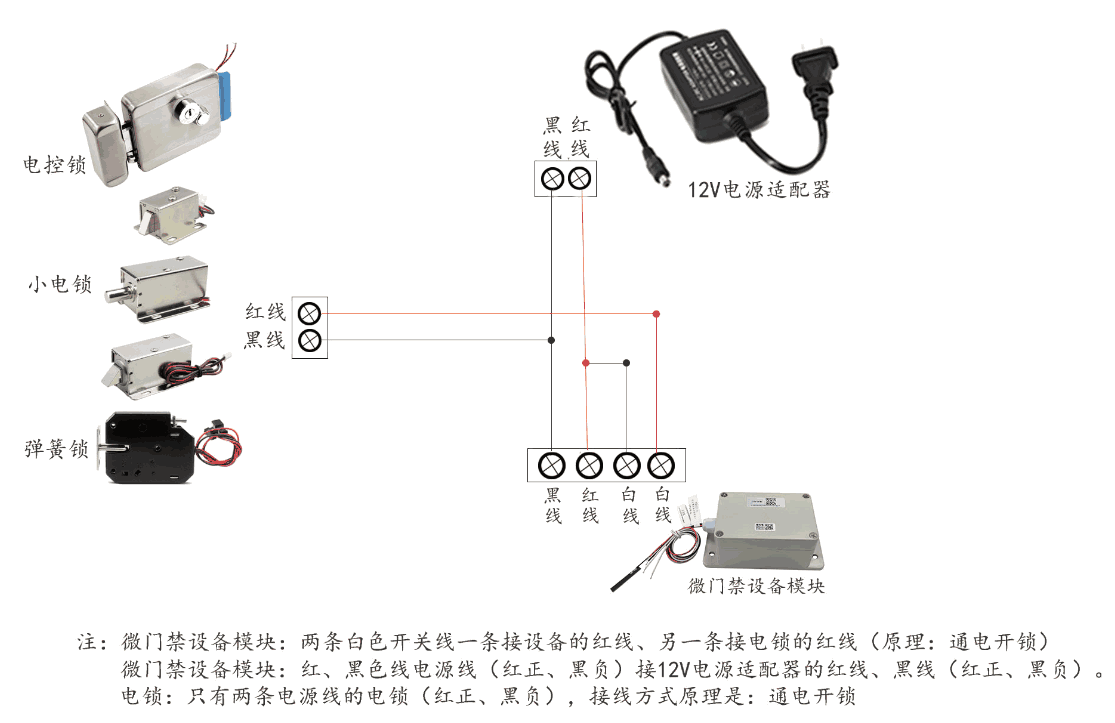 3.微门禁微信开门模块引出两组线,一组12V电源线(红正、黑负),另一组白色(或白色和蓝色)开关线。(原理:手机点击开门时两条开关线导通1秒,接到出门开关接线柱上,相当于代替人工去按一下出门开关)