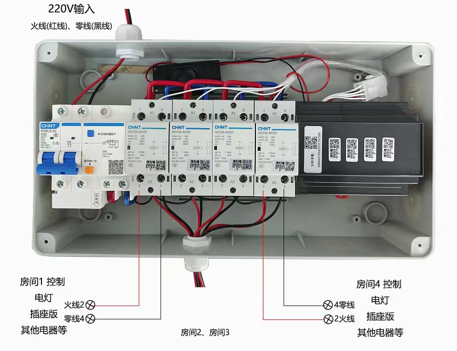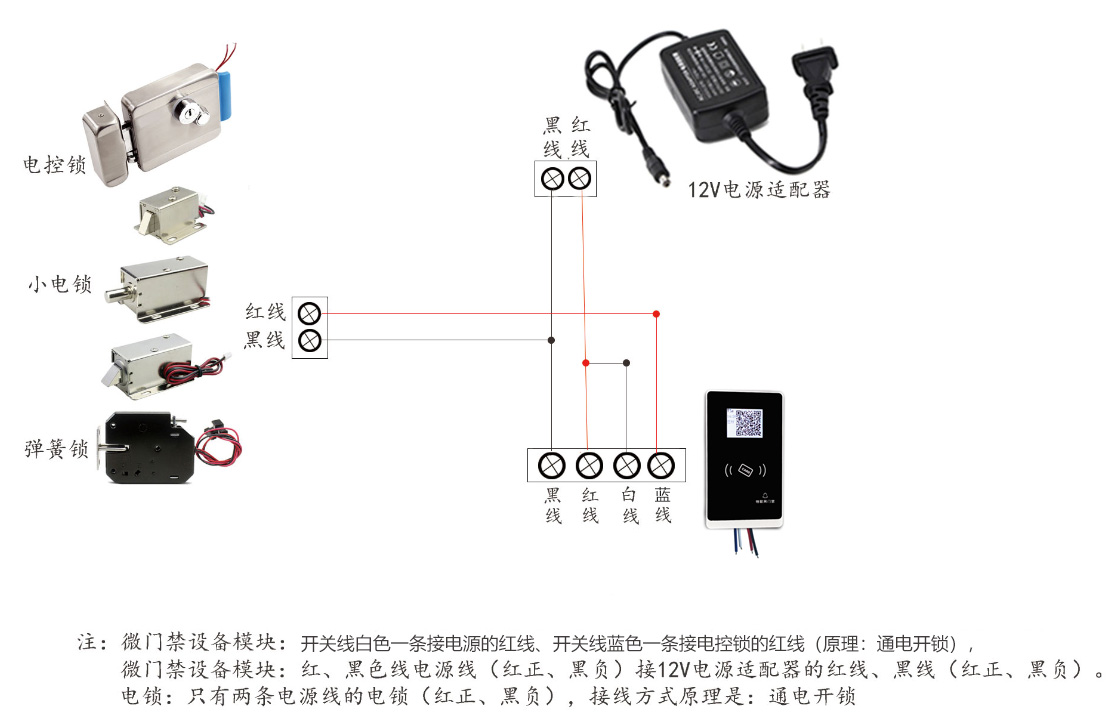 2.微门禁微信开门模块供电方式:12V供电,和门禁锁共用一个12V5A的专用门禁电源。